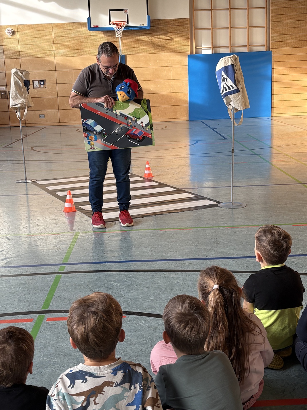 Am Freitag vor den Herbstferien durften die ersten Klassen jeweils eine Schulstunde in der Turnhalle am Programm der ADAC Stiftung „Aufgepasst mit Adacus“ teilnehmen.