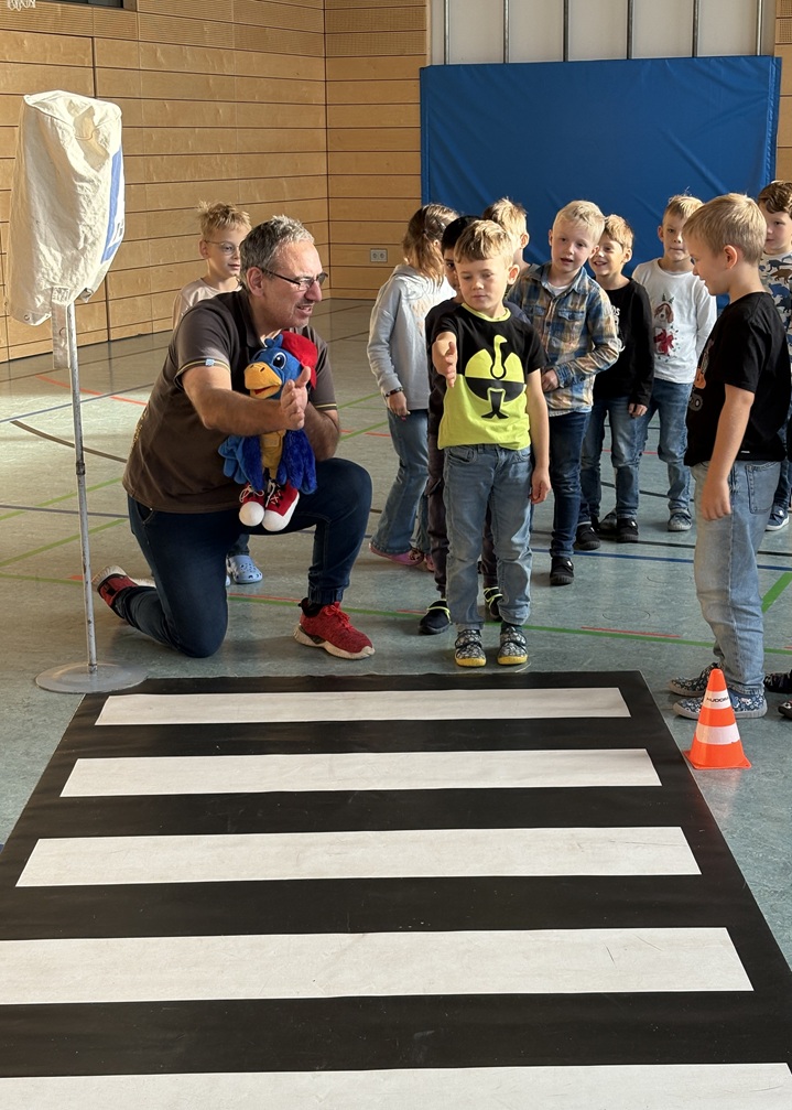 Adacus, das Maskottchen der ADAC Stiftung „Verkehrshelden“ führte den Kindern vor, wie man sich richtig im Straßenverkehr verhält. Handzeichen geben, links – rechts – links schauen und mit Blickkontakt, ausgestreckter Hand und zügig über die Straße gehen.