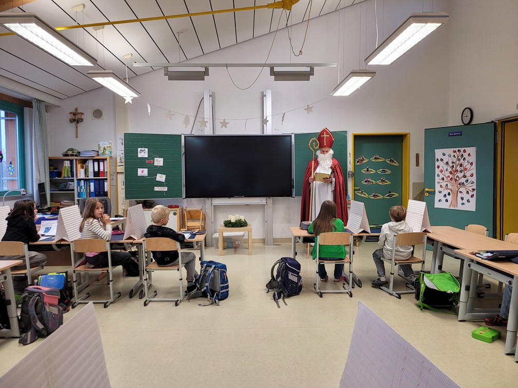 Am 5. Dezember erhielt die Grundschule Steinsberg besonderen Besuch: Der Nikolaus kam höchstpersönlich vorbei, um die Schülerinnen und Schüler zu überraschen. Mit seinem goldenen Buch unterm Arm wusste er genau, was die einzelnen Klassen im vergangenen Jahr besonders gut gemacht hatten – vom fleißigen Lesen über gegenseitige Hilfe bis hin zu tollen Gemeinschaftsprojekten. Natürlich hatte er auch ein paar liebevolle Verbesserungsvorschläge dabei, damit alle weiterhin so gut zusammenarbeiten können.